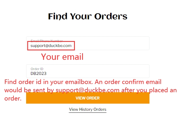 You can check the order by entering the Order Tracking page, enter the email address you filled in when you placed the order, and check the order confirmation email from support@ducebe.com to get your order number: [DBxxxx].
