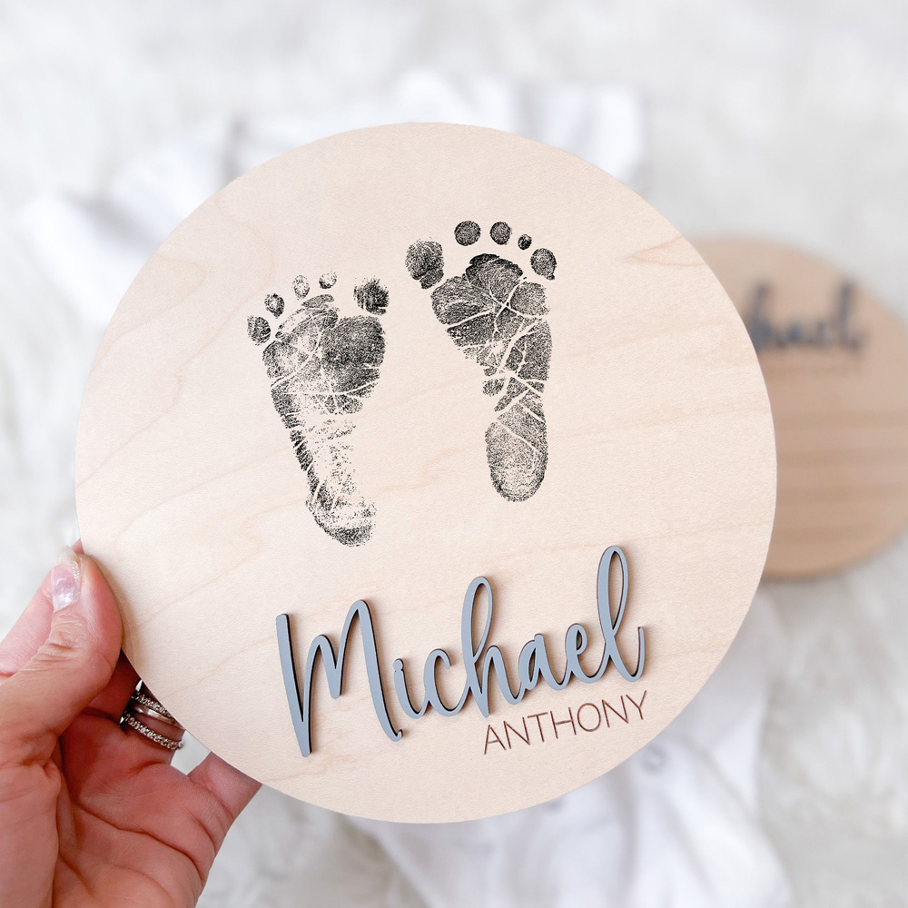 This sign has a 3D first name and engraved middle name and stats. Perfect for birth announcement and photo prop.
