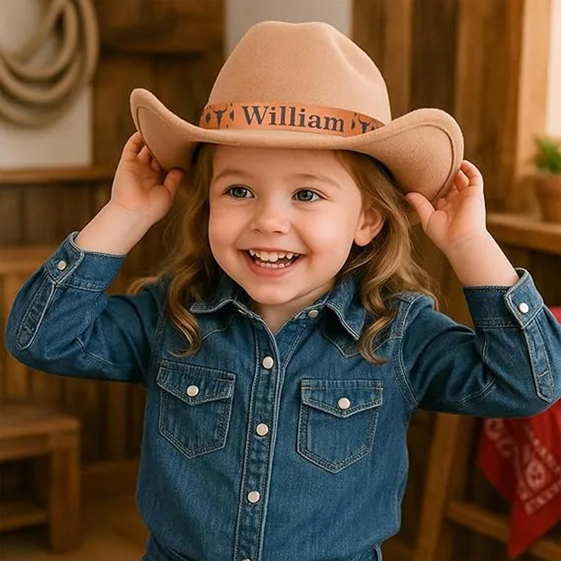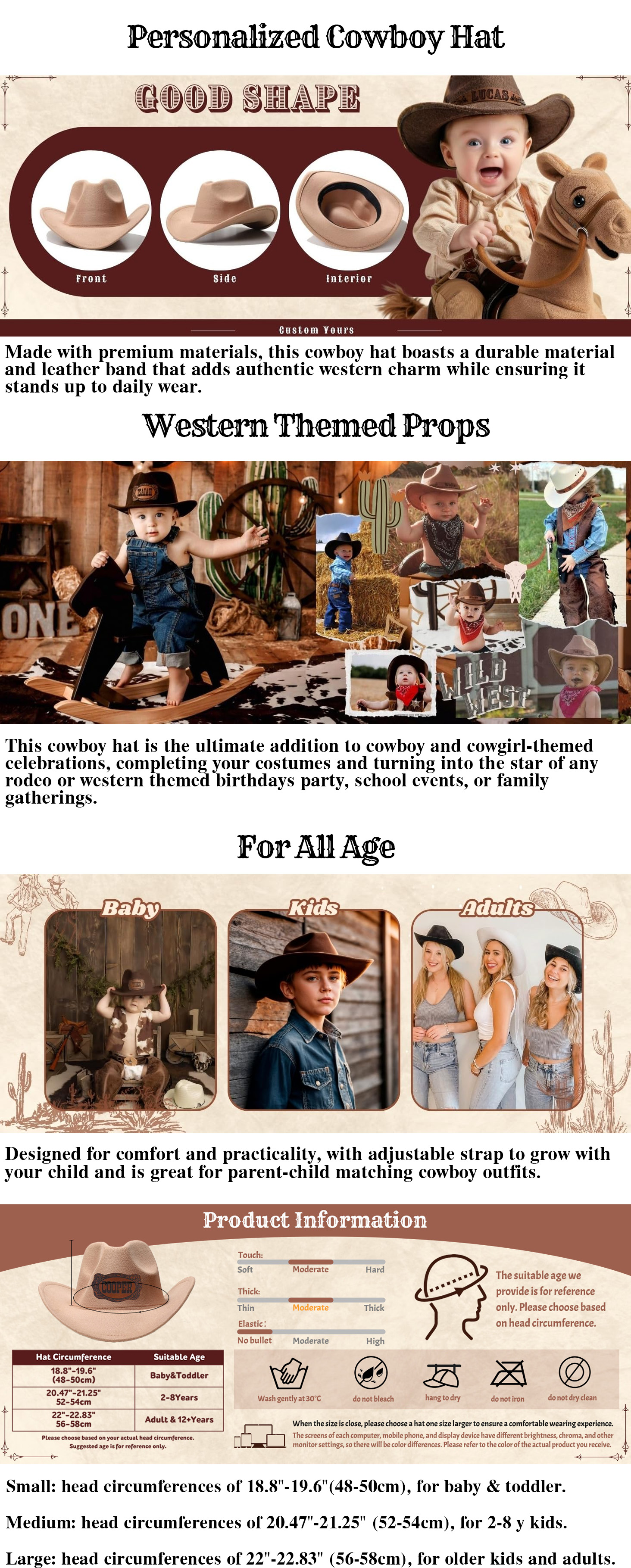 Our personalized cowboy hat is crafted from durable premium materials with a leather band for authentic western charm. Perfect for cowboy or cowgirl-themed parties, school events, rodeos, and family gatherings, it’s available in sizes for babies, kids, and adults. The adjustable strap ensures a comfortable fit as your child grows, making it ideal for parent-child matching outfits.